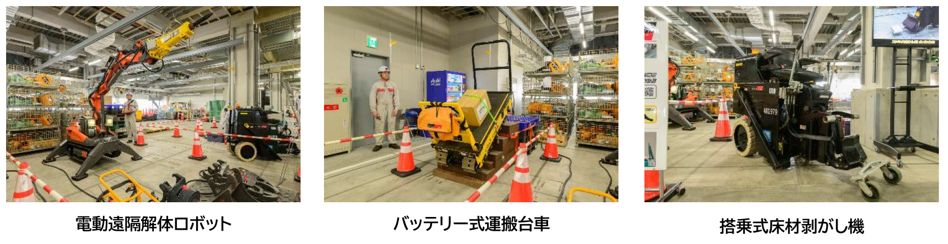 電動遠隔解体ロボット、バッテリー式運搬台車、搭乗式床材剥がし機など、遠隔で操作できる解体機械、内装解体などで使われる環境面に優れた商品を展示しました。電動遠隔解体ロボットは、Bluetooth通信で50m程度まで遠隔操作が可能です。バッテリー式運搬台車は、電源が無い現場でも重量物を移動できます。最大登坂は40度、斜面での積載は500kg、平地では1tの積載が可能となります。バッテリー式の搭乗式床材剥がし機は、Pタイルなどを力強く剥がすことができ、100Vで充電ができ、8時間から10時間の長時間作業が可能です。