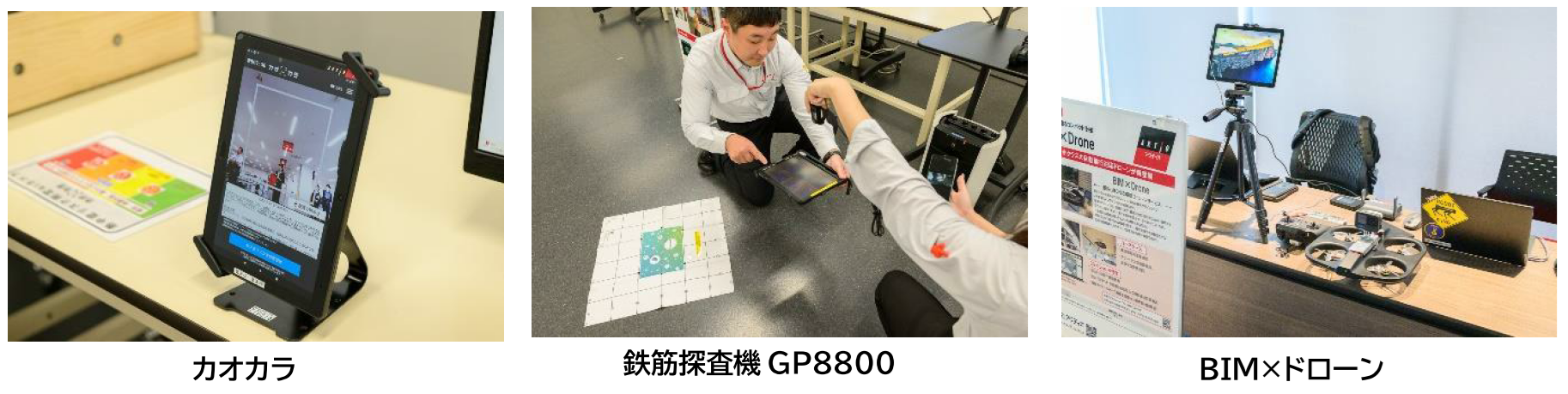 通信やICT技術を活用した現場の安全管理と効率化を推進する商品を展示しました。AIカメラで熱中症リスクを判定する「カオカラ」、出来上がった構造物の中の鉄筋を探査する「鉄筋探査機GP8800」、屋内点検用 ドローン「BIM×ドローン」など、作業員の安全確保と建設現場の生産性向上に貢献します。