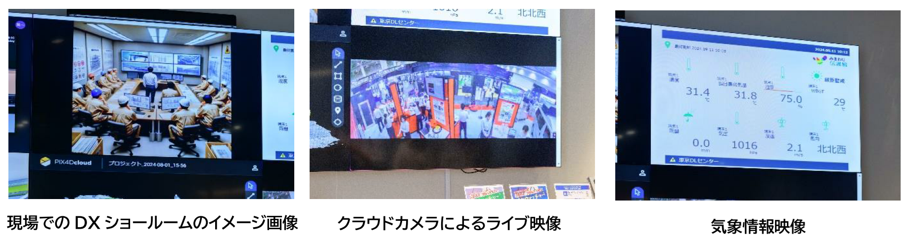 大阪DLセンターに設置されているアクティオDXショールーム大阪は、現場の情報をすべて集約し、「現場のことがすべてわかる」をコンセプトにしています。リアルタイムで現場の全容を把握するため、複数のモニターを活用します。クラウドカメラによる現場のライブ映像を映し、別のモニターでは先週の現場の様子を投影するなど、過去の映像記録、気象情報、機械の稼働状況、BIMデータなどを同時に表示します。これにより、工事の進捗管理や安全確保が効率化され、建設業界のDXを加速させ、現場の「見える化」を実現します。