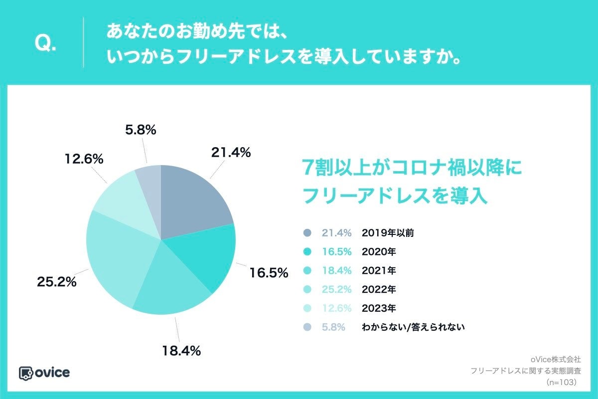 「Q.あなたのお勤め先では、いつからフリーアドレスを導入していますか。」(n=103)と質問したところ、「2019年以前」は21.4%のみとなり、7割以上の企業がコロナ禍以降にフリーアドレスを導入していることがわかりました。