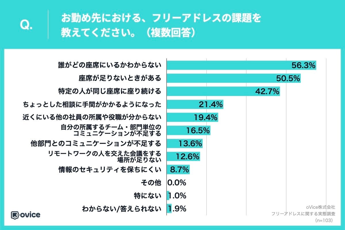 「Q.お勤め先における、フリーアドレスの課題を教えてください。(複数回答)」(n=103)と質問したところ、「誰がどの座席にいるかわからない」が56.3%、「座席が足りないときがある」が50.5%、「特定の人が同じ座席に座り続ける」が42.7%という回答となりました。