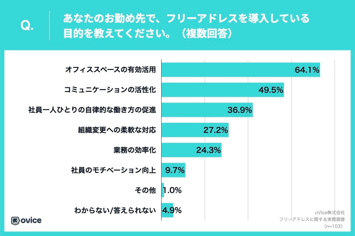 「Q.あなたのお勤め先で、フリーアドレスを導入している目的を教えてください。(複数回答)」(n=103)と質問したところ、「オフィススペースの有効活用」が64.1%、「コミュニケーションの活性化」が49.5%、「社員一人ひとりの自律的な働き方の促進」が36.9%という回答となりました。コストや効率だけでなく、社員の働き方に変化を促すことも目的とされていることがわかりました。