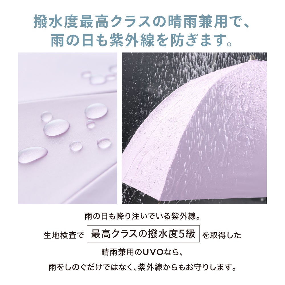 生地検査で最高クラスの撥水度5級を取得したUVOであれば、雨をしのぐだけでなく紫外線も防ぐことができるので、天気の変わりやすい季節でも1本あれば重宝します。
