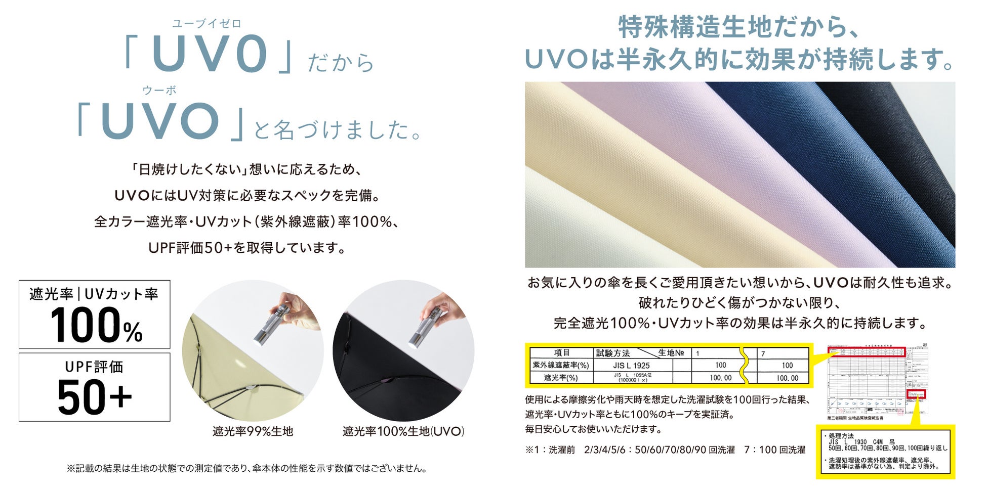 UVOの生地は全カラー遮光率100%/UVカット率100%/UPF50+を実現し、夏の暑い日差しや1年を通して降り注いでくる紫外線をしっかりブロック。またお気に入りの傘を長くご愛用いただきたいという想いから耐久性も追求しています。UVOの特殊構造生地は破れたりひどく傷つかない限り完全遮光100%を半永久的に持続することができ、生地品質検査でも実証されています。