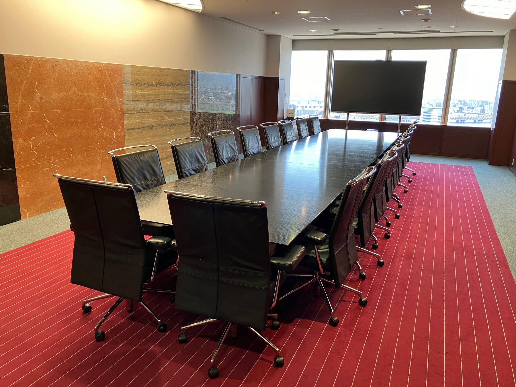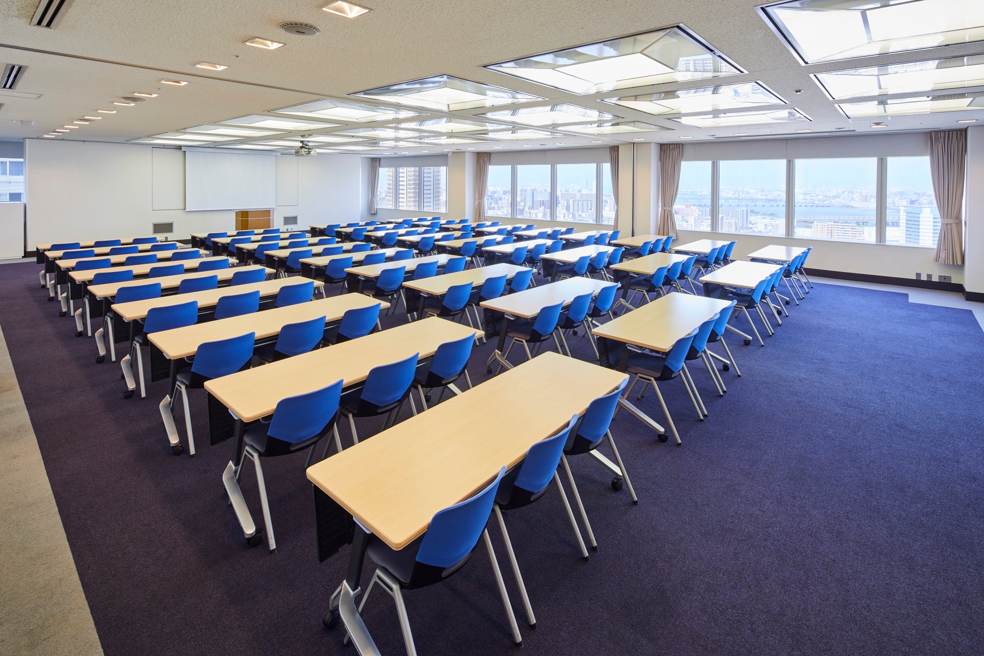 貸会議室は、全室に窓を備えた開放感あふれる空間が特徴で、梅田の高層ビル群や淀川対岸まで広がる街並みを一望できる眺望が魅力です。自然光が注ぐ明るい会場は、会議やセミナーはもちろん、採用イベントや式典などのフォーマルなシーンにもふさわしい上質な環境を提供します。
