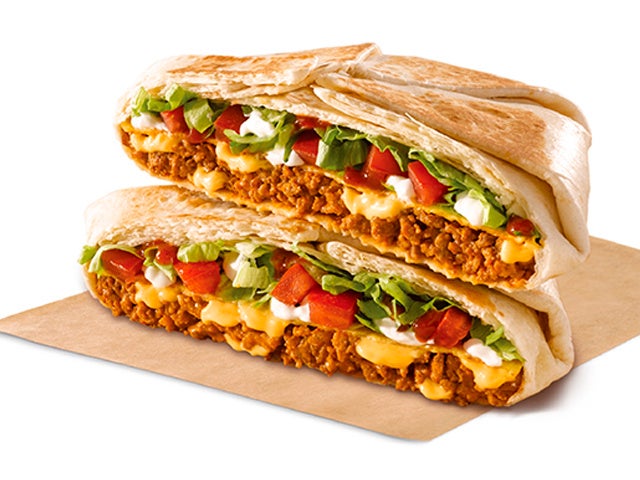 ビーフ(またはチキン)、サワークリーム、カリッと揚げたトスターダ、とろとろのチーズソースに新鮮なレタスとトマトを重ねてトルティーヤで六角形に包み、香ばしくグリルした「クランチラップスプリーム」