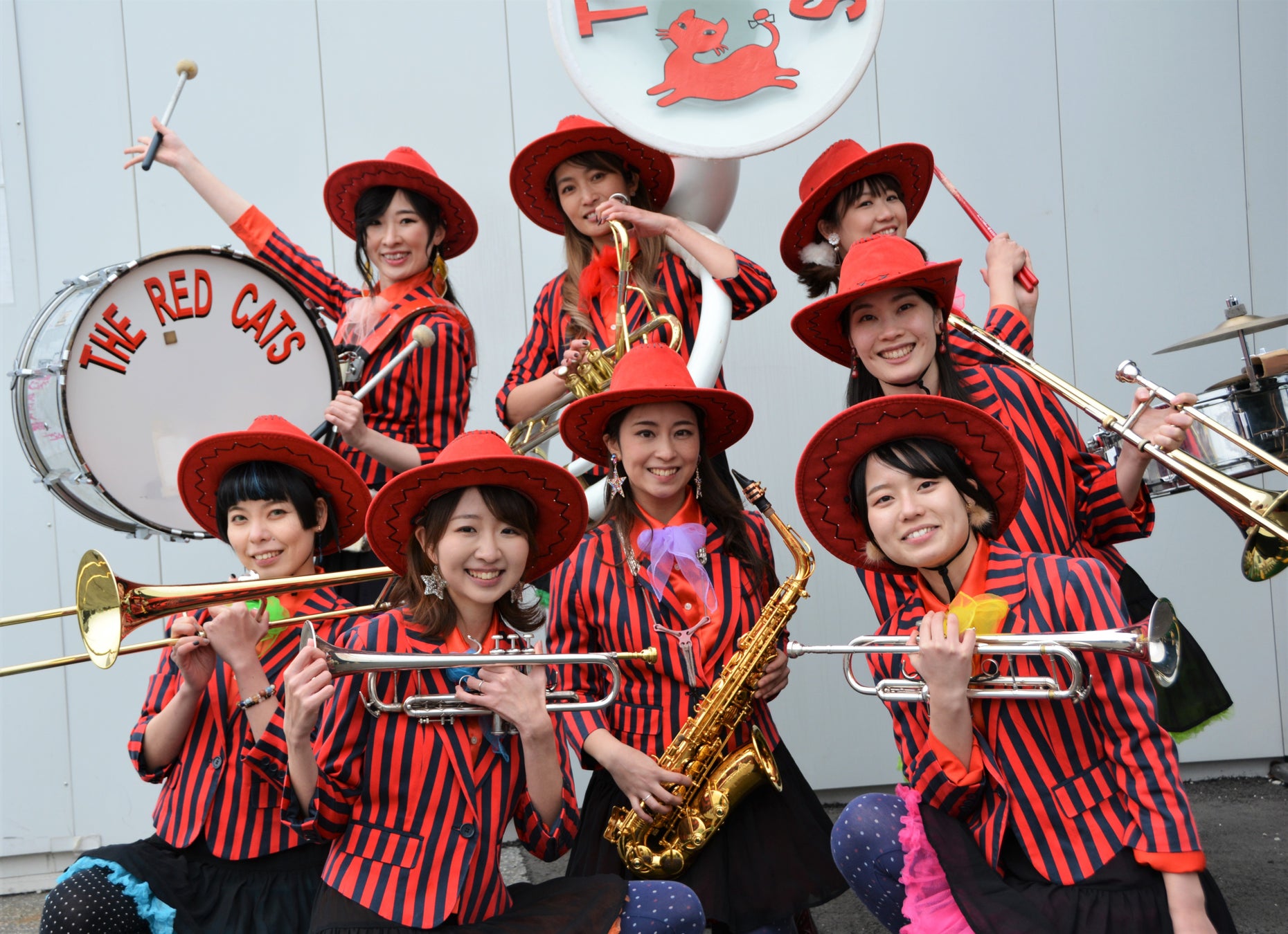 見て聞いて楽しくなる女子踊るブラスバンド「THE RED CATS」が5番館内を賑やかにパレードします。