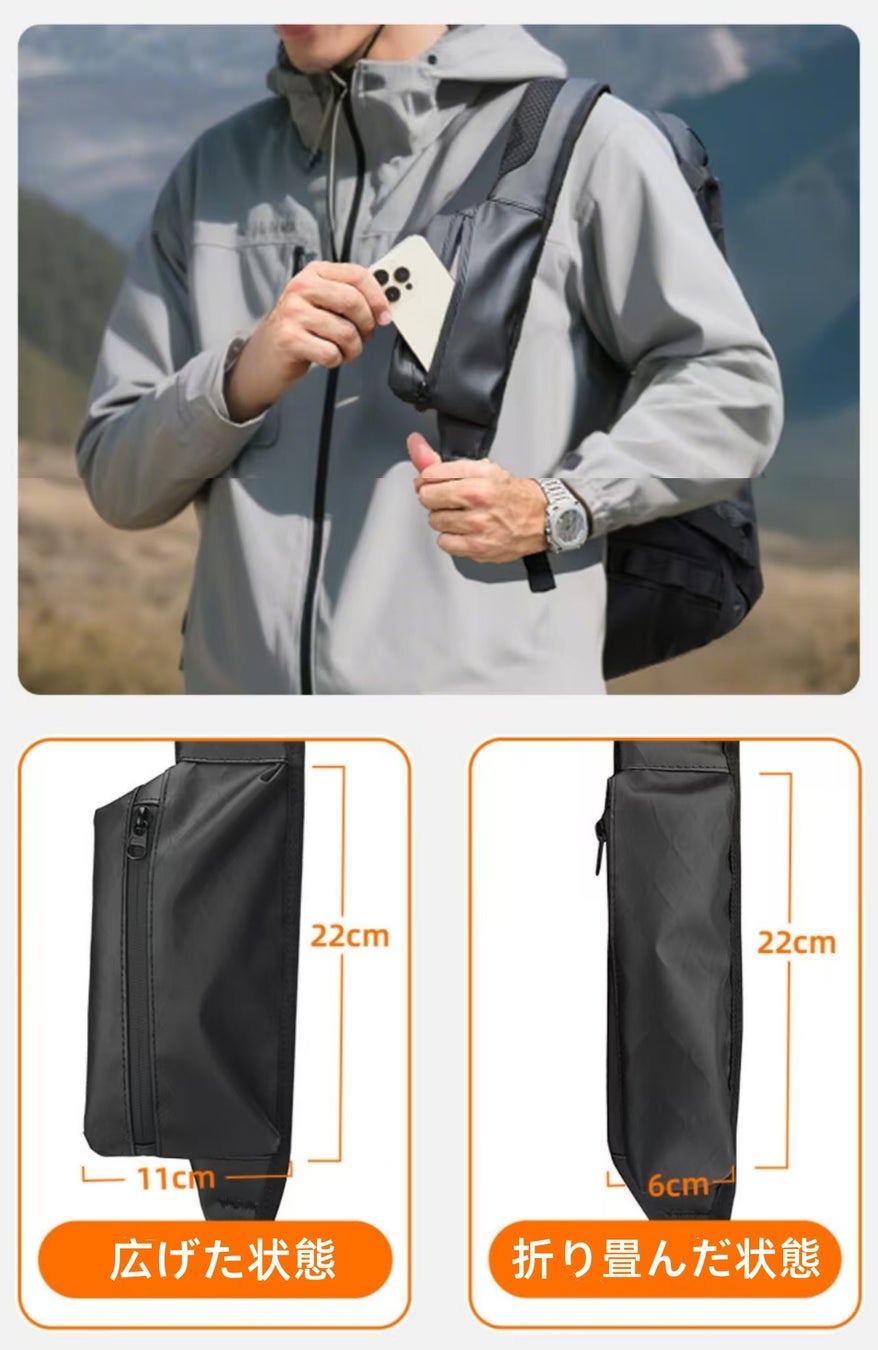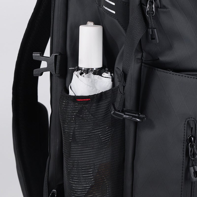 背負った状態で手に届きやすい左側に、ボトルや傘収納ポケットを配しました。