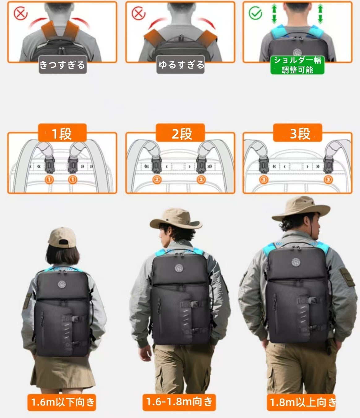 3.3WAYショルダー幅調節システム、体型が異なっても、フィットした快適な着用感を実現します。