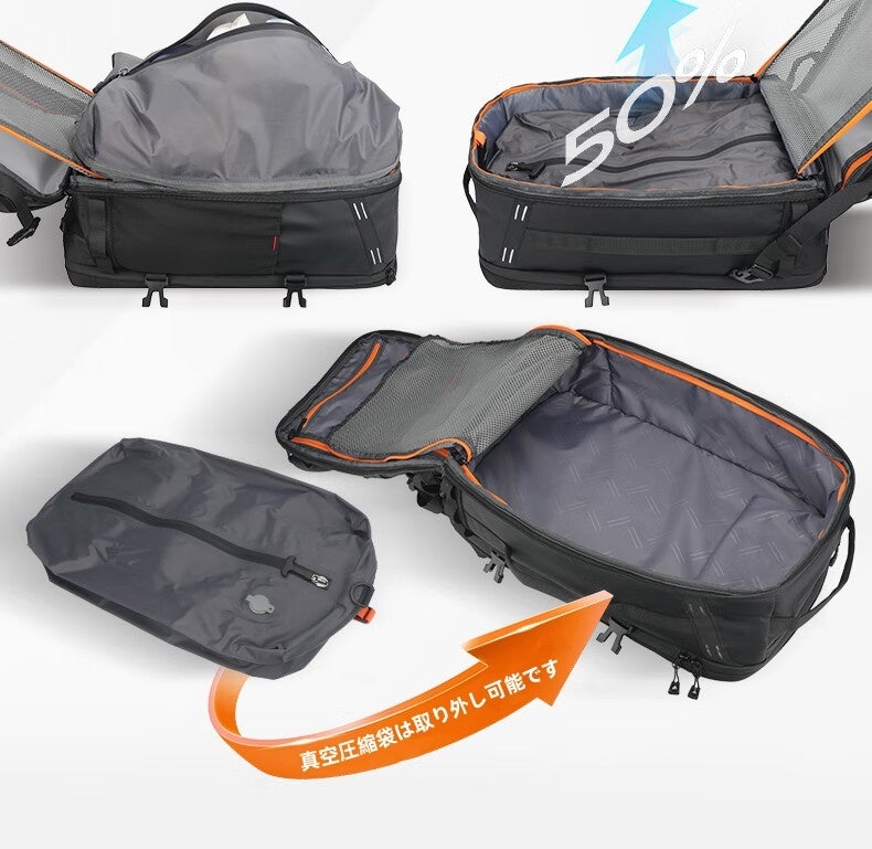 1.外見はリュックの形をしていながら、スーツケース並みの驚き大容量!真空圧縮バッグとポンプ付き!