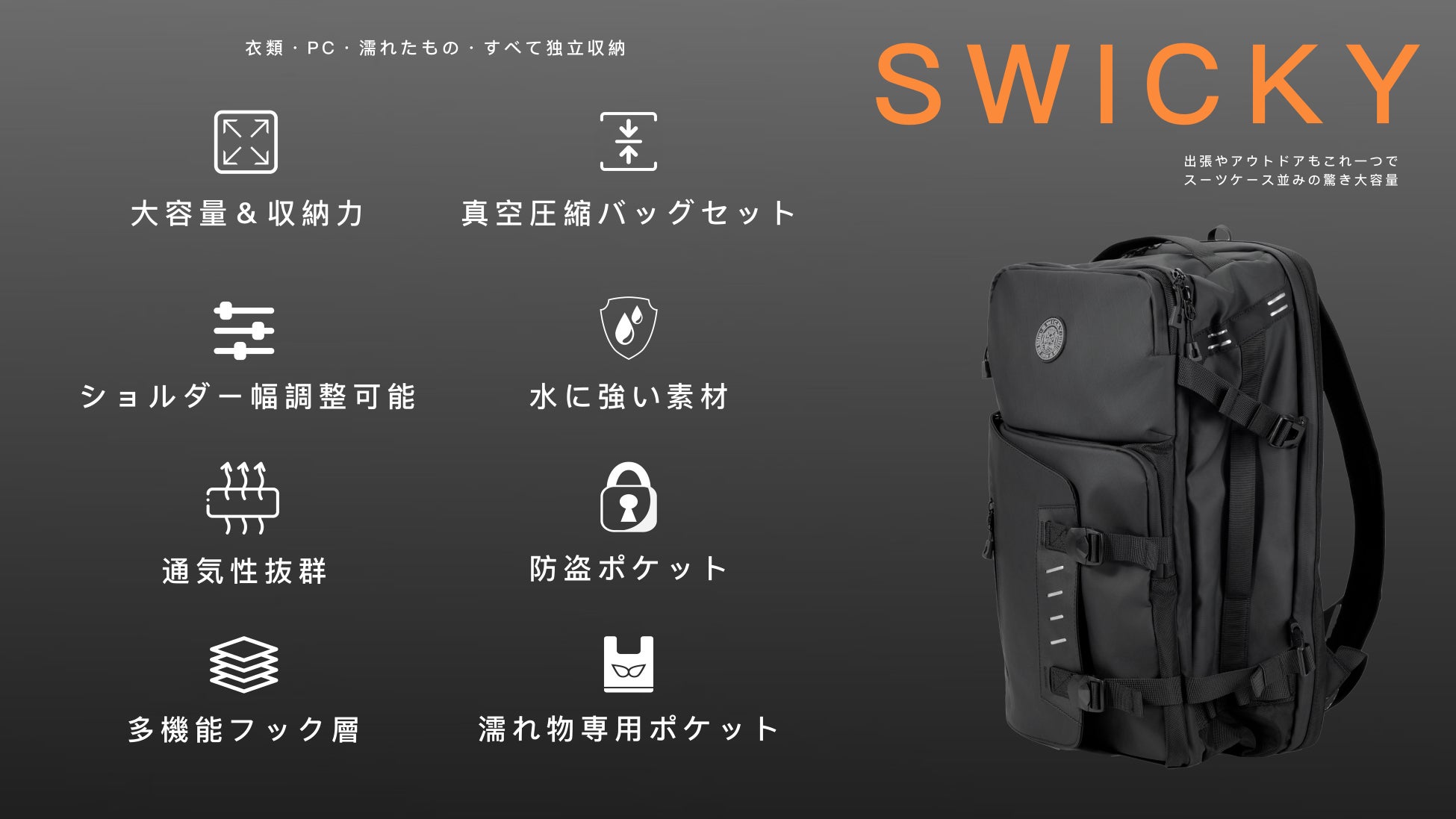 SWICKYのバックパックは、真空圧縮バッグとポンプをセットで、実用的なデザインが特長です。
