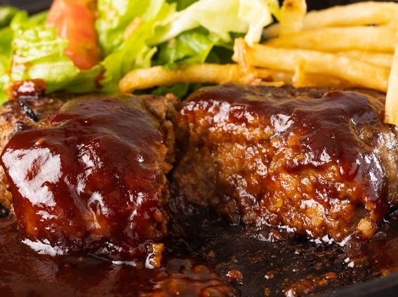 柔らかな食感に仕上げたハンバーグは、どこか懐かしい王道のおいしさ。デミグラスソースをたっぷりかけて、お子様から大人まで楽しめる一皿にしました。サラダとブロッコリー、オニオンフライ、フライドポテトがついてバランスも◎ライス付き