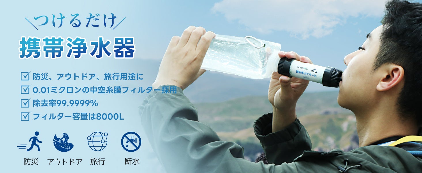 特徴:0.01ミクロン中空糸膜フィルター、厚生労働省水質検査適合品、緊急用ホイッスル付き