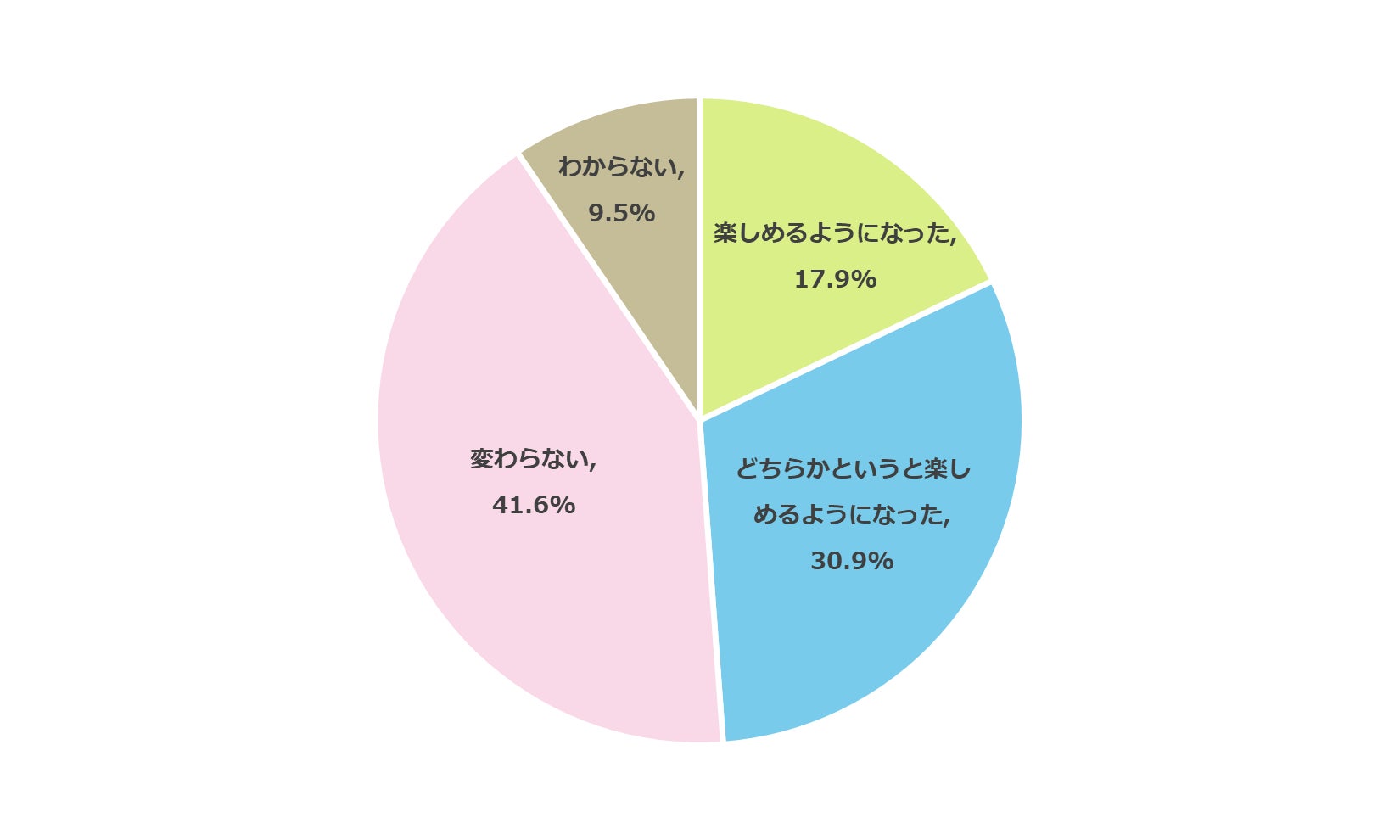 自主学習により、子どもが学ぶことを楽しめるようになったか質問したところ、48.8%が「楽しめるようになった」(楽しめるようになった:17.9%、どちらかというと楽しめるようになった:30.9%)と、約半数が自主学習の影響で、学ぶことを楽しめるようになったと回答しました。