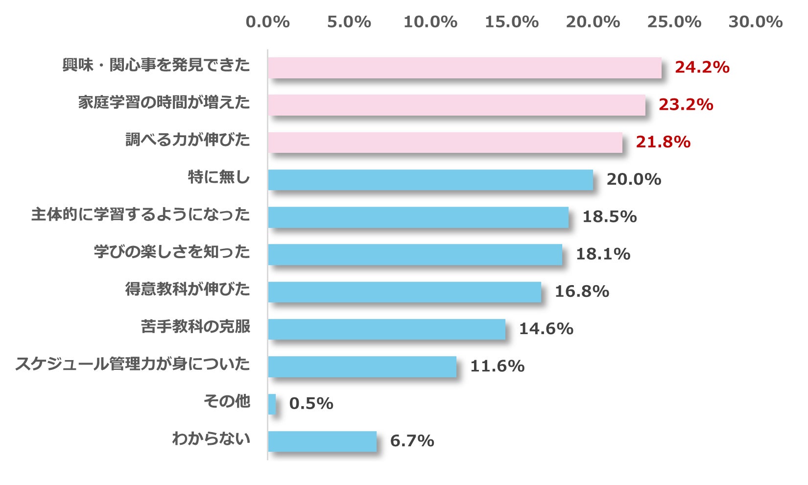 保護者が感じた自主学習の効果、最多回答は「興味・関心事を発見できた」