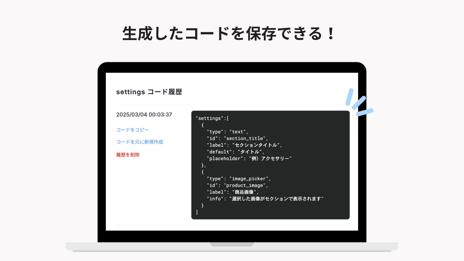 「UnLiquidSchema」では、生成した Liquid スキーマのコードを保存しておくことが可能です。保存したコードはいつでも再利用ができるため、追加修正や新しいプロジェクトでの流用など、効率的なワークフローを実現します。