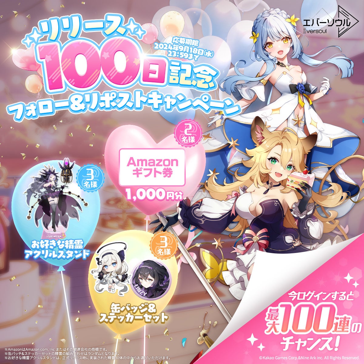 『エバーソウル』の正式サービス開始100日を記念した「フォロー&リポストキャンペーン」を実施中です。参加者の中から抽選で「Amazonギフト券」「公式アクリルスタンド」「公式缶バッジ&ステッカー」をプレゼントします。『エバーソウル』公式Xをフォローした状態で、該当キャンペーンポストをリポストして是非ご参加ください。