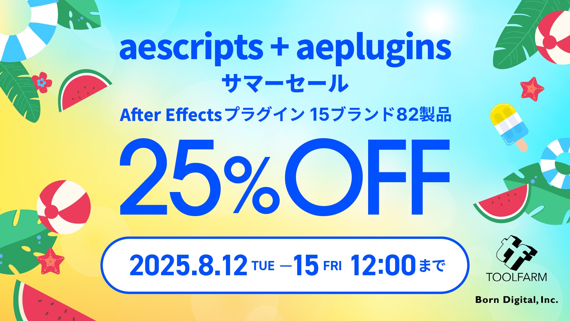 株式会社ボーンデジタル(本社:東京都千代田区、代表取締役:新 和也、URL:https://www.borndigital.co.jp)が運営する、映像制作ソフトウェア向けプラグイン専門オンラインストア「Toolfarm Japan」では、2025年8月12日(火) ~ 15日(金) の4日間限定で、「aescripts + aeplugins サマーセール」を開催しております。