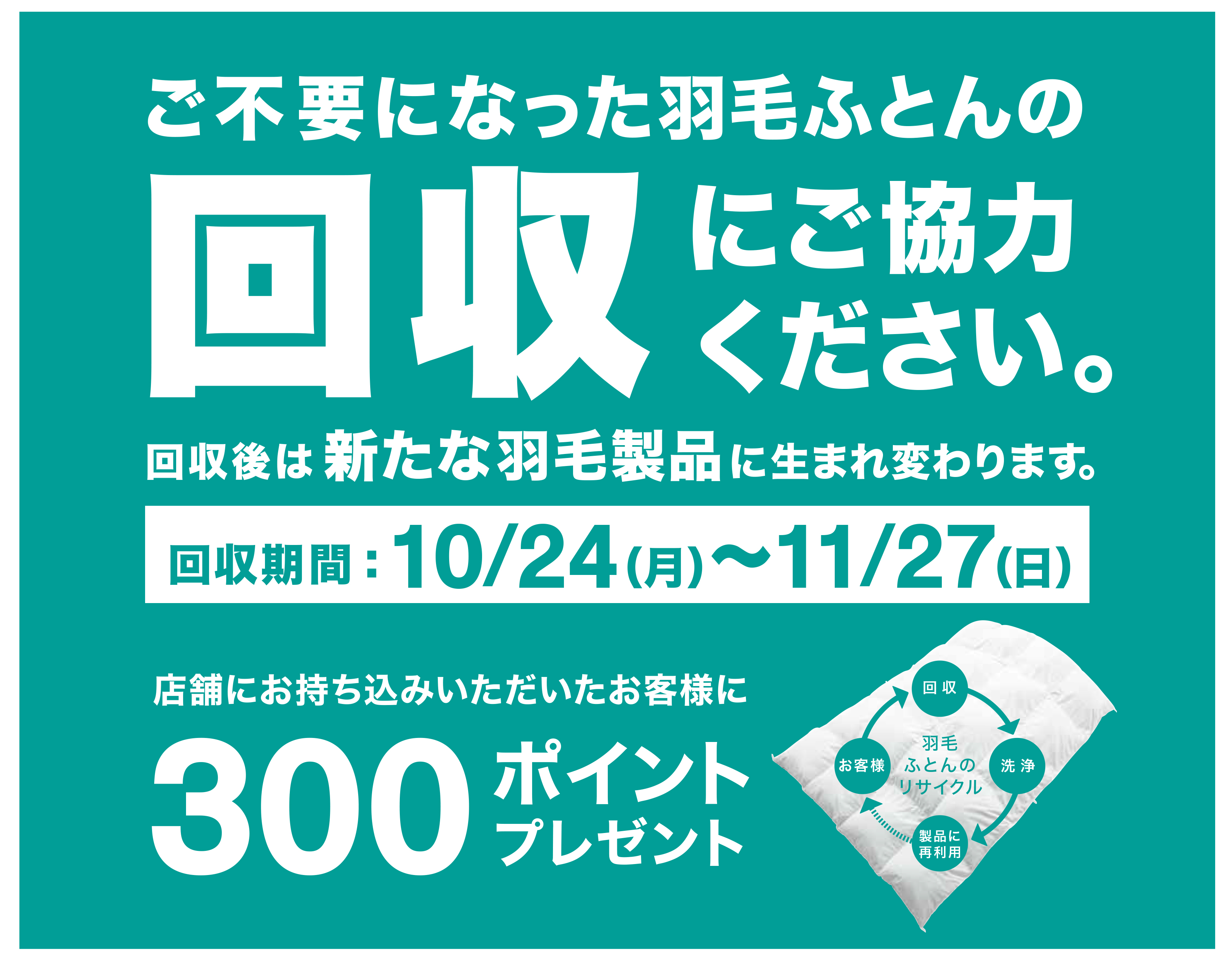 ※羽毛布団をキャンペーン前にご注文いただき、該当商品を後日店頭にてお引き取りいただく際に回収ができるよう、対象期間を9月26日(月)~11月27日(日)とさせていただいております。