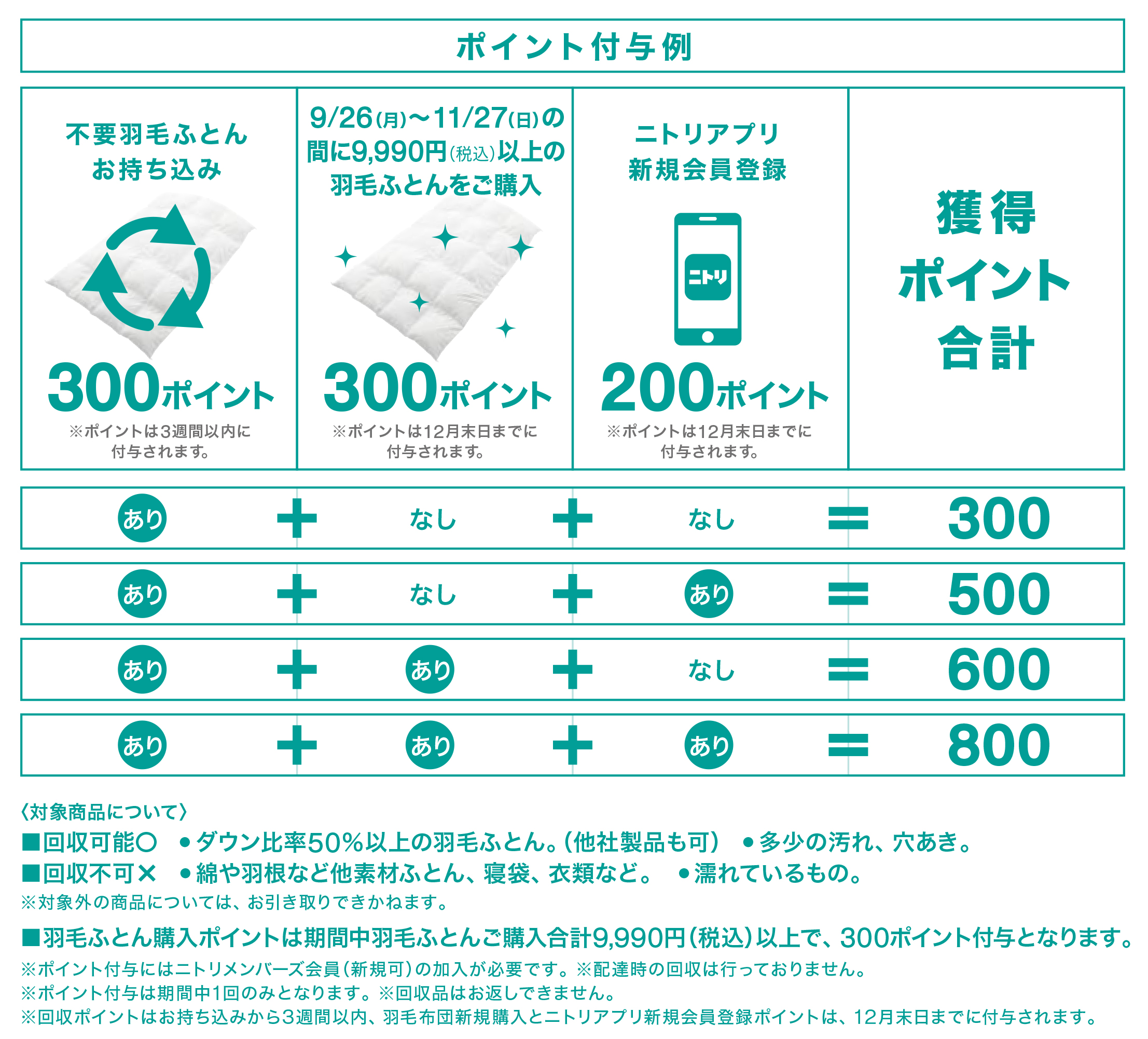 また、羽毛布団リサイクルキャンペーンにご協力いただいたお客様で、対象期間中(9月26日~11月27日)、以下条件に該当されるお客様には、更にニトリポイントをプレゼントいたします。