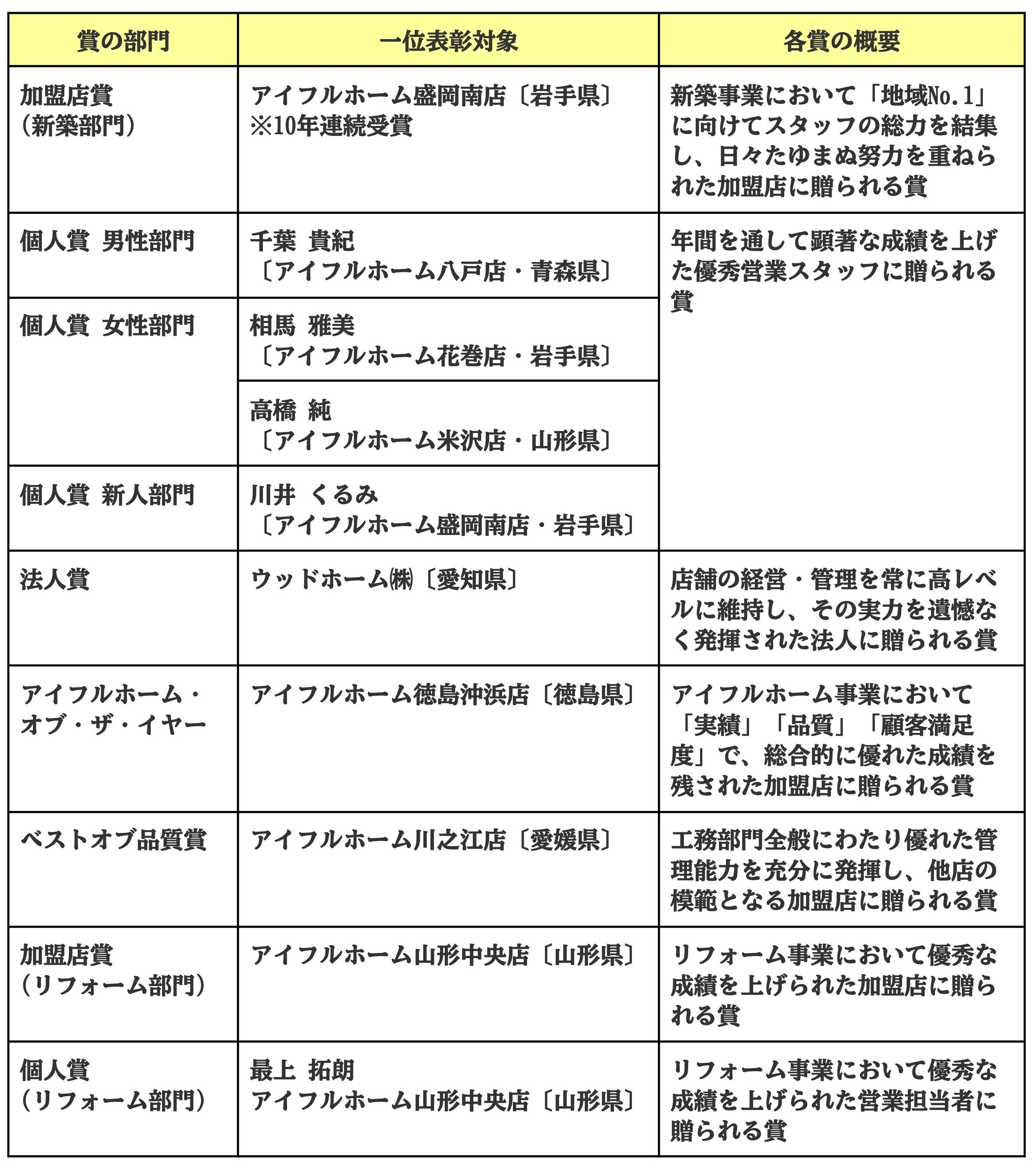 ベストオブ品質賞はアイフルホーム川之江店が、アイフルホーム・オブ・ザ・イヤーはアイフルホーム徳島沖浜店が受賞。加盟店賞 新築部門は、アイフルホーム盛岡南店が10連覇を達成しました。なお、2023年度の各種コンテストの受賞者・受賞店は次頁の通りです。