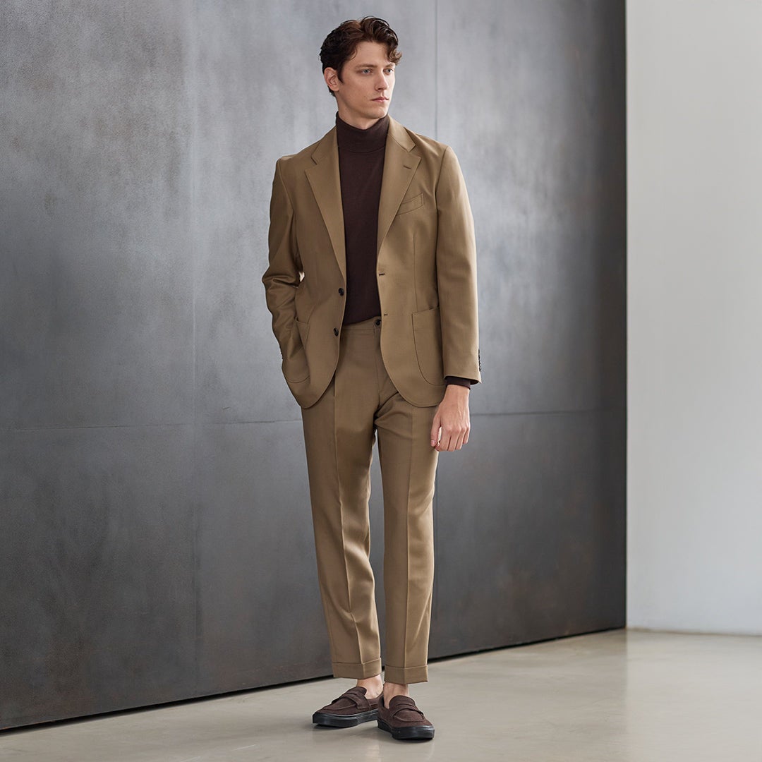 SUPER120'sのファインウール原料を高密度に織り上げ、上品な光沢と保温性を兼ね備えた人気のセットアップです。ジャケット・トラウザー共にテーラーが監修。美しいデザインと快適な着用感を実感いただけます。