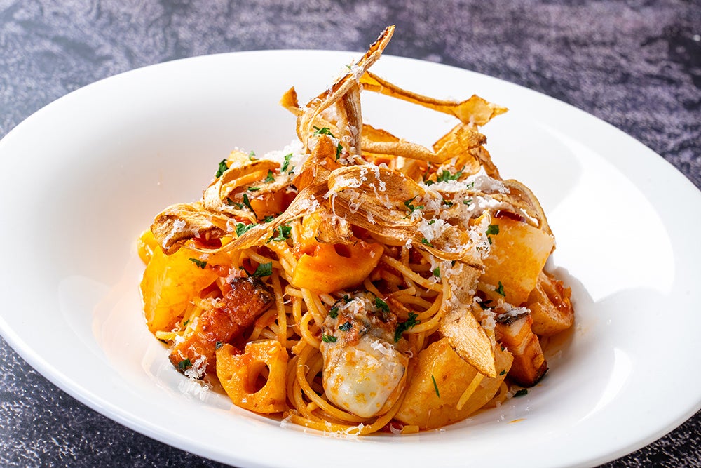 【メニュー名】北海道サロマ湖産カキと冬野菜、「農家のベーコン」のアマトリチャーナ