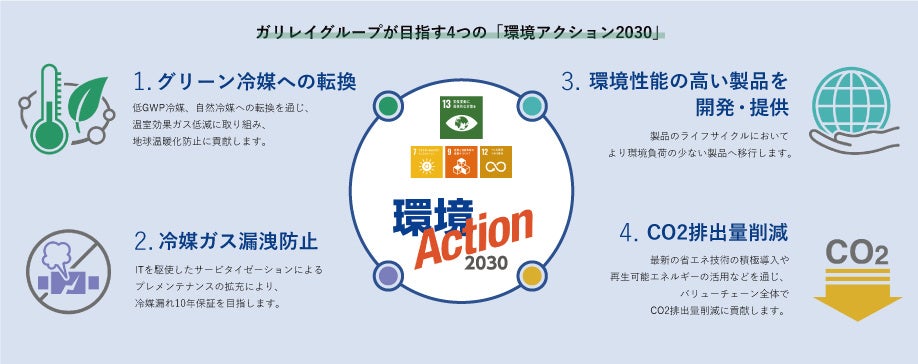 2021年には環境ビジョン『Dramatic Future 2050』を策定し、開発製造する冷凍機内蔵型製品の平均GWPを、2020年の2,008から、2025年には500以下にします。更に2025年製品・施工物件より冷媒漏洩による地球温暖化ゼロを目指し冷媒ガス漏れ10年保証の開始を予定しています。