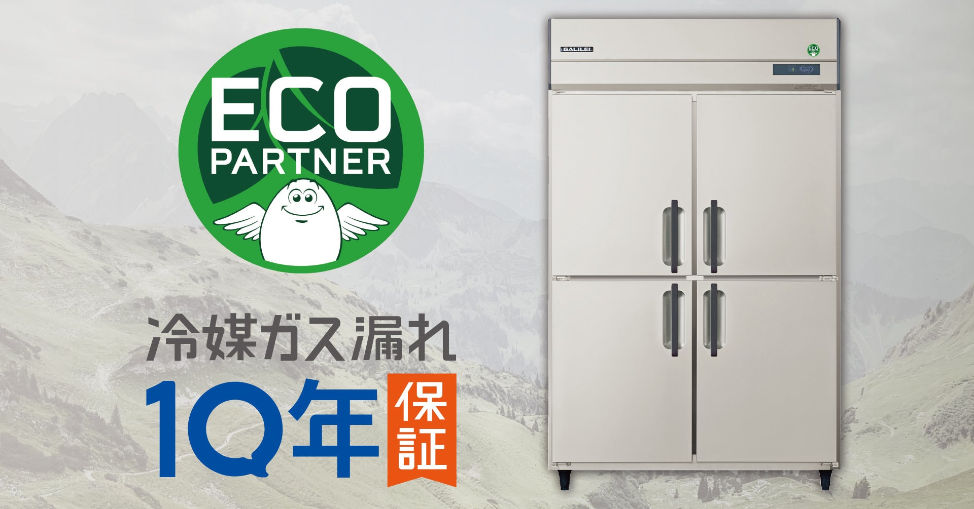 フクシマガリレイは、業務用冷蔵庫にグリーン冷媒「R1234yf」を業界で初めて採用し、更に「冷媒ガス漏れ10年保証」サービスも実施することで、ノンフロン化を強力に推進しています。