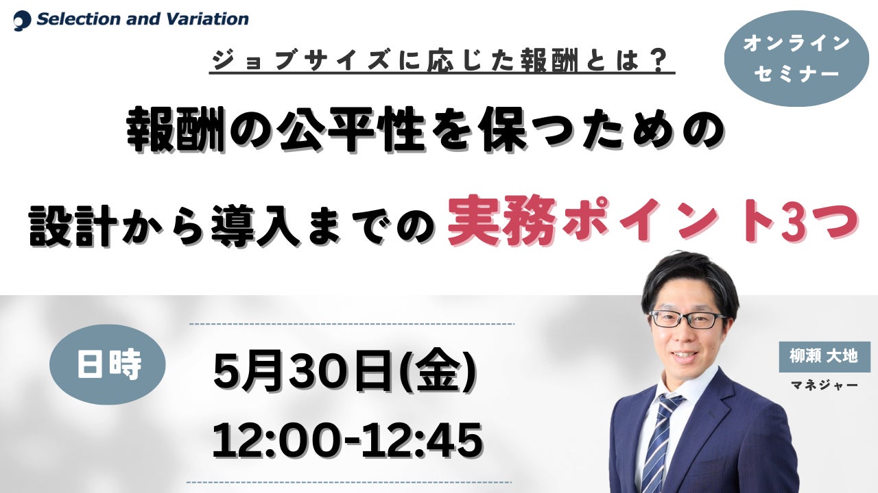 組織・人事コンサルティングファームであるセレクションアンドバリエーション株式会社(以下、当社、東京都千代田区丸の内、大阪市西区、名古屋市西区 / 代表取締役社長:平康慶浩/ URL:https://sele-vari.co.jp/ )は『応募多数の企業には秘訣があった!選ばれる会社になるための求人票改善5つのポイント』セミナーを2025年5月30日(金)12:00〜12:45に開催することをお知らせいたします。