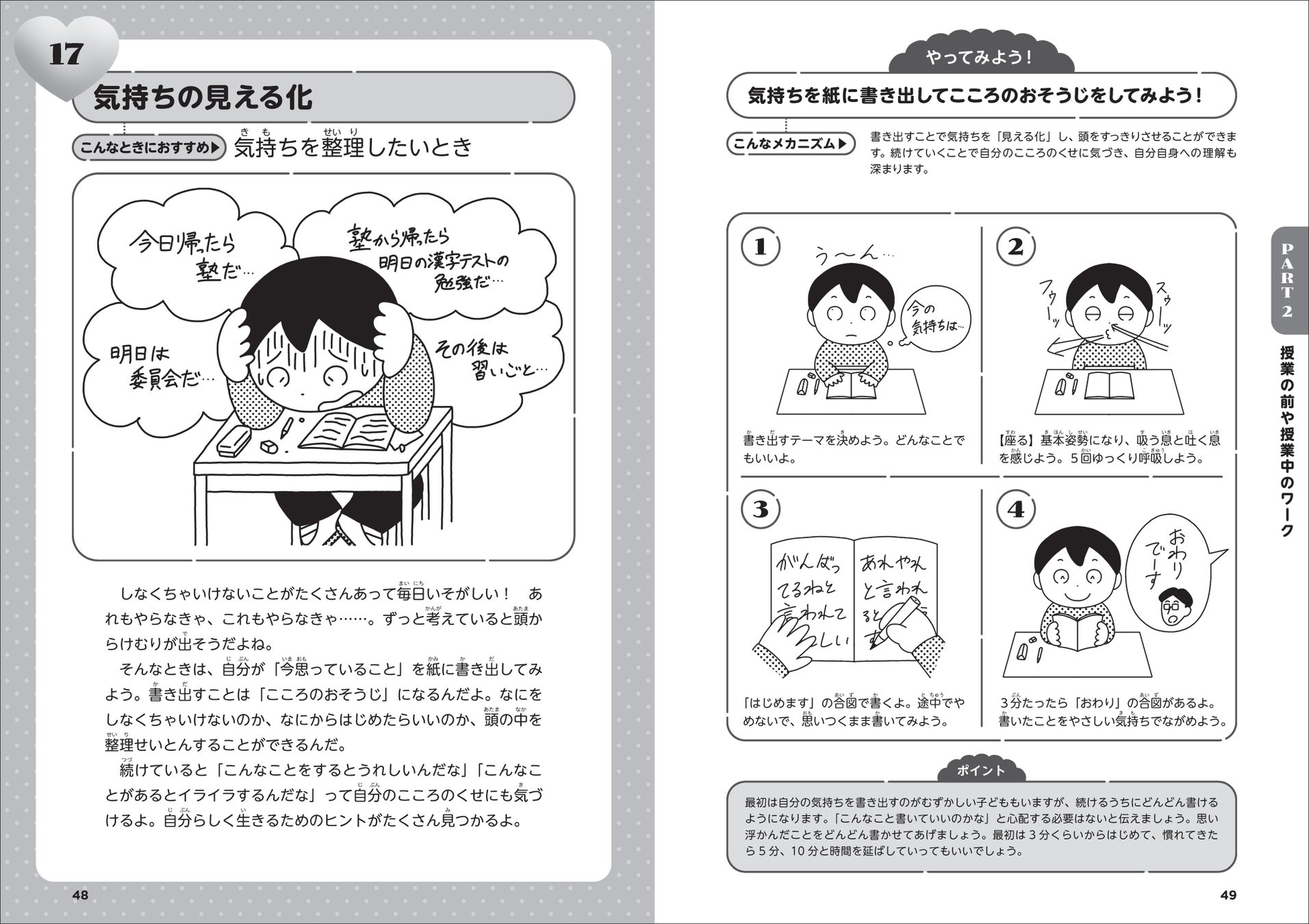 1 左ページでは子どもが不安や緊張を感じる場面を取り上げています。ワークの導入として使えます