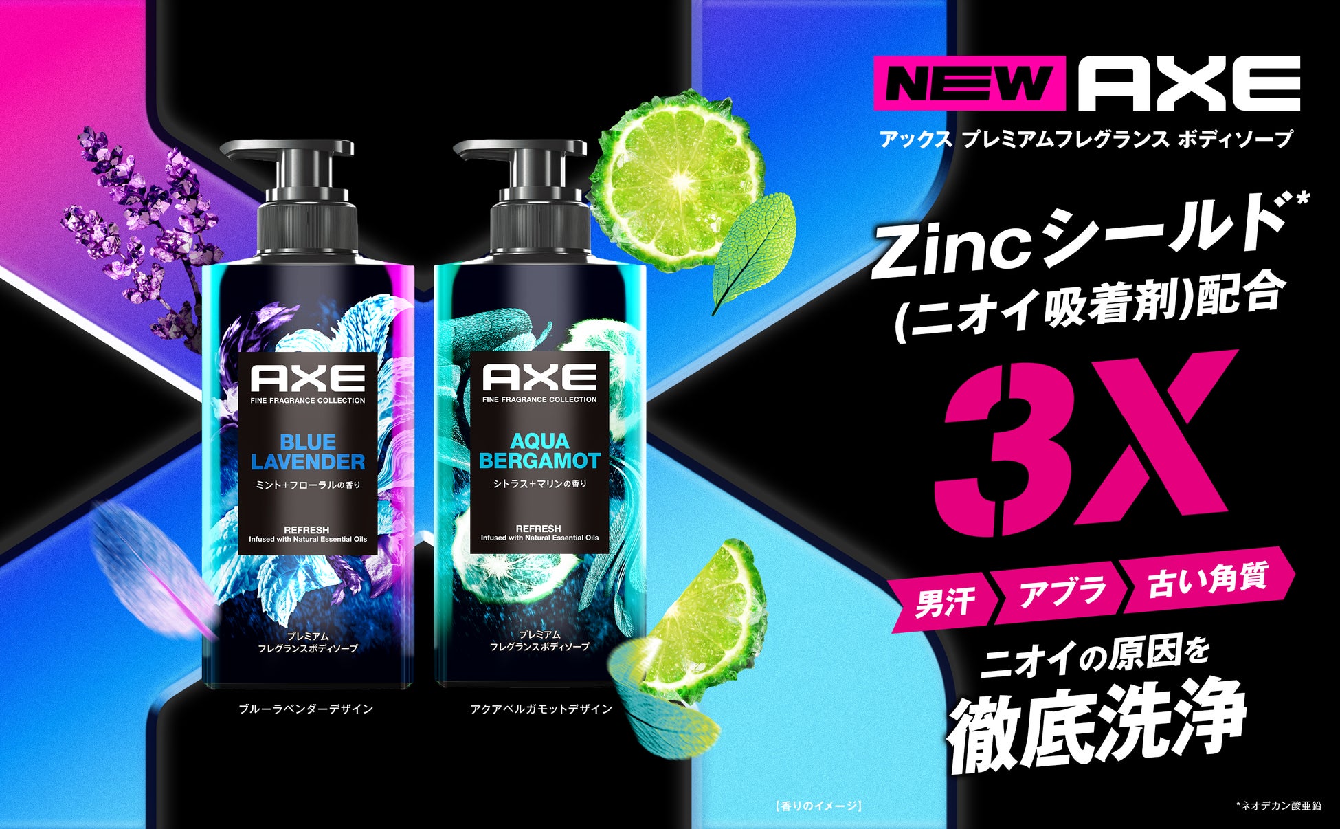 香りはシトラスとマリンが融合した爽快なアクアベルガモットと、ミントとフローラルが調和した落ち着きのあるブルーラベンダーの2種類。ボディスプレーは、日本初*¹となる「Zincシールド ニオイ吸着テクノロジー」を搭載。イヤなニオイを吸着し、心地よい香りを長時間持続させます。ボディソープにも「Zincシールド*²(ニオイ吸着剤)」を配合。 汗や皮脂など、ニオイの原因を徹底洗浄。さらに、男汗・アブラ・古い角質の3つの汚れに着目し、「トリプルクレンジング成分*³」を配合。 清潔感のある肌へ導きます。
