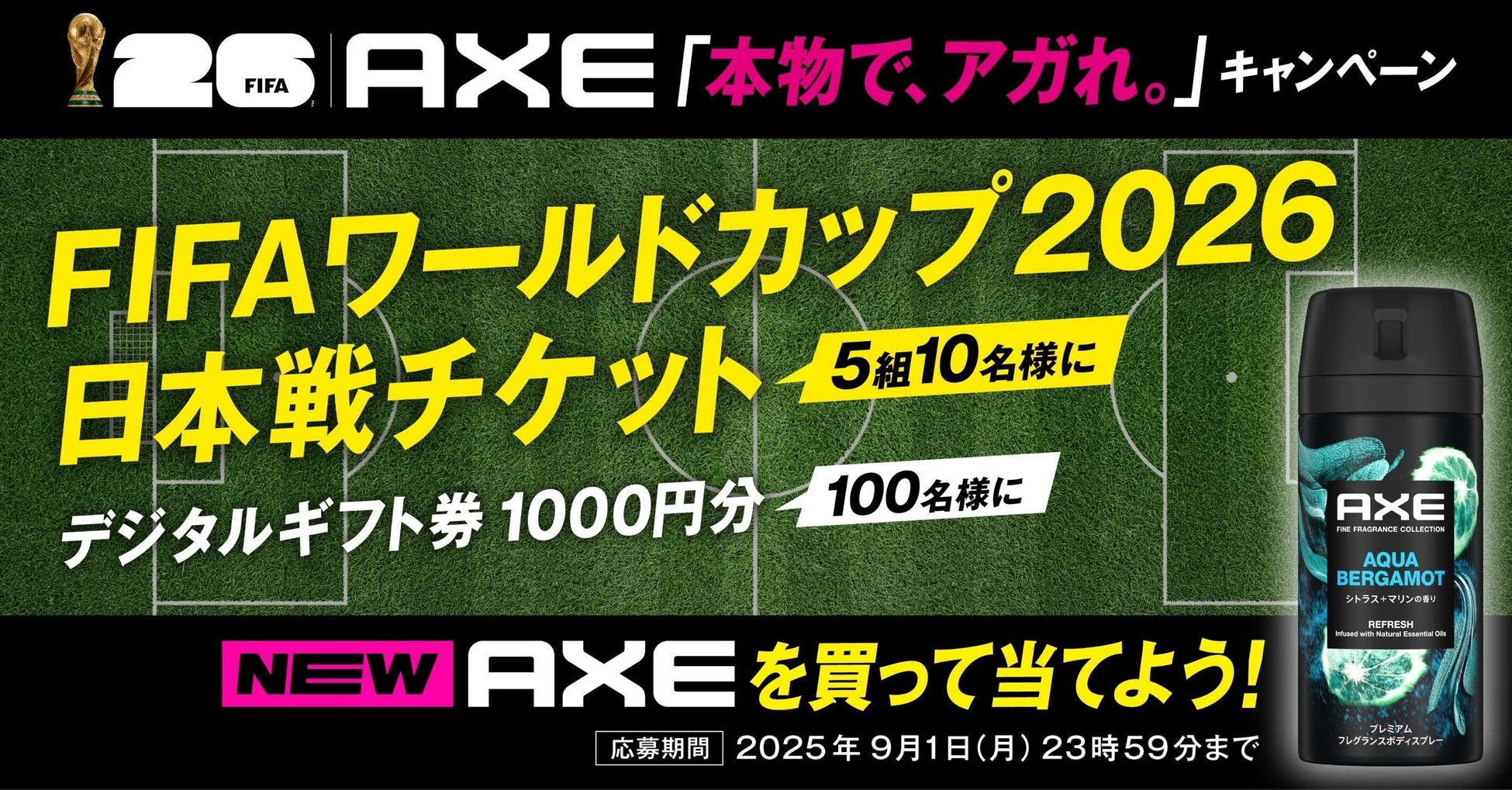 AXEでは、新製品の発売に合わせて “本物を体感できる” プレゼントが当たる「本物で、アガれ。」キャンペーンを全3回実施中です。第3弾はFIFAワールドカップ2026日本戦の観戦チケットが当たるキャンペーンを実施いたします。