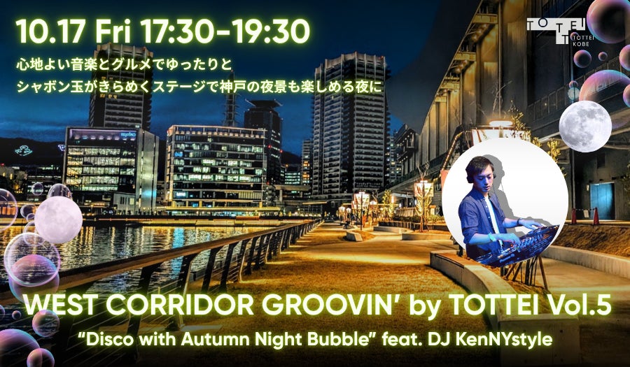 株式会社One Bright KOBE(住所:神戸市中央区、代表取締役社長 渋谷 順)は、海風が涼しく心地いいTOTTEIで、10月17日(金)にTOTTEI WEST CORRIDOR(Infosys GATE前)にて、DJナイト「WEST CORRIDOR GROOVIN’ by TOTTEI Vol.5」を開催します。