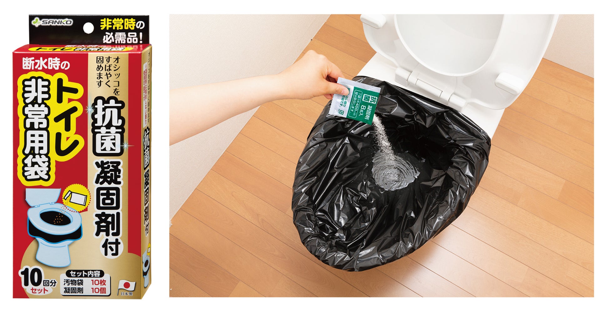 素材 |便座・本体・補強板:ポリプロピレン、ゴムキャップ:エラストマー、凝固剤:高分子ポリマー、汚物袋:ポリエチレン