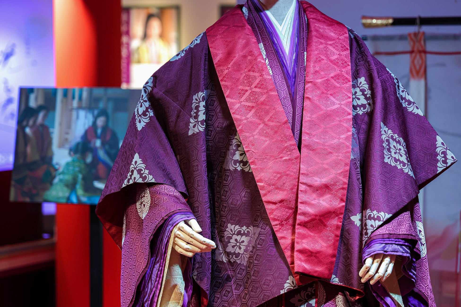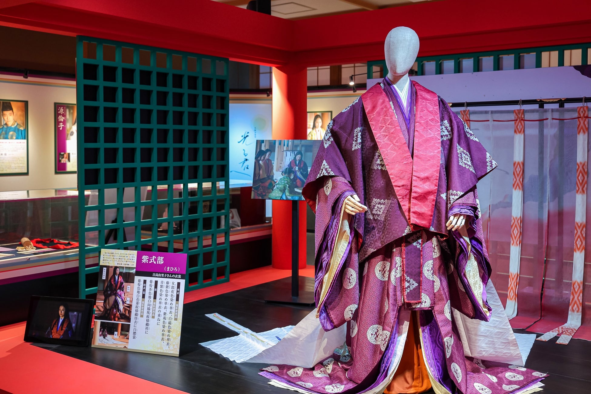 ドラマ第42回「川辺の誓い」からまひろ(紫式部)が着用している女房装束(十二単)。 深い紫色が印象的な正絹の衣装(撮影使用品)が見られるのは、大津の「大河ドラマ館」だけ!必見です!