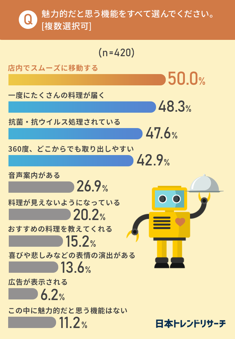 実際に「配膳ロボット」に搭載されている機能で代表的なものを挙げ、その中から魅力的だと思うものを選んでもらいました。