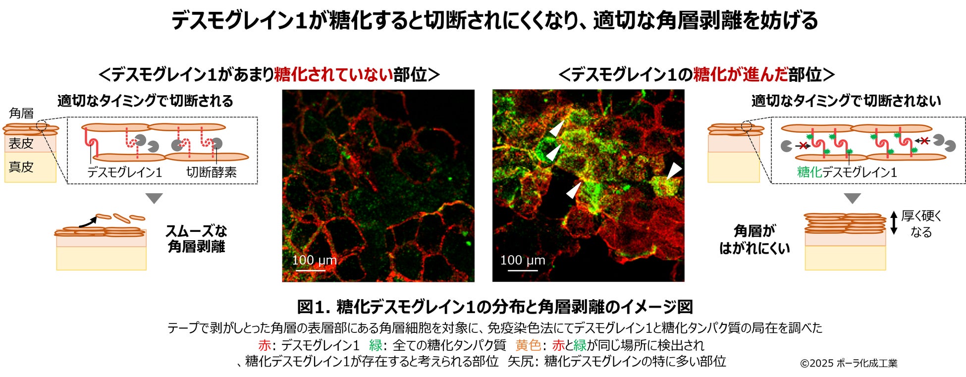 今回新たに明らかにした糖化デスモグレイン1に関する知見は、コルネオデスモソームが適切なタイミングで切断される仕組みを理解する上で重要な手がかりとなります。
