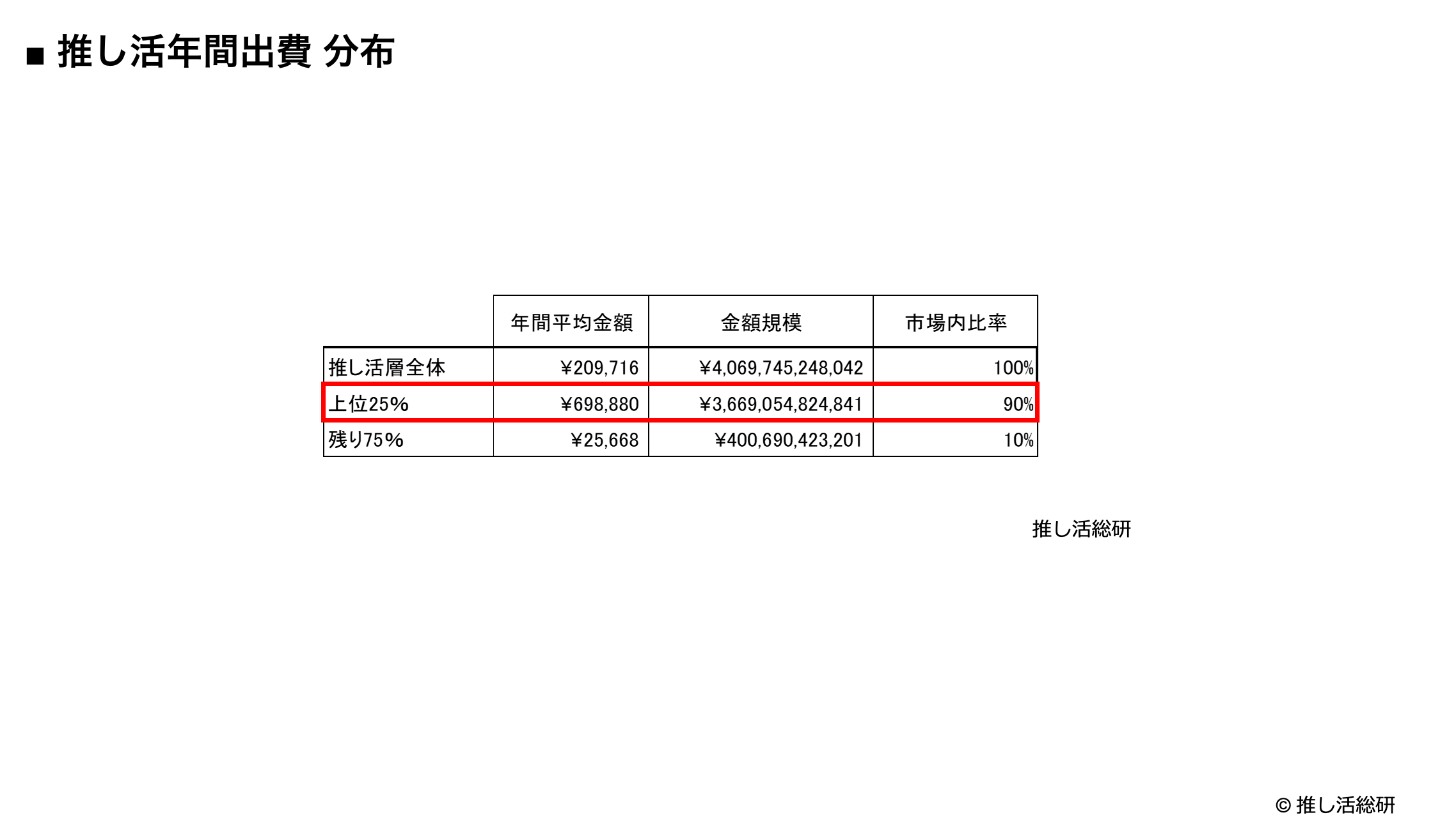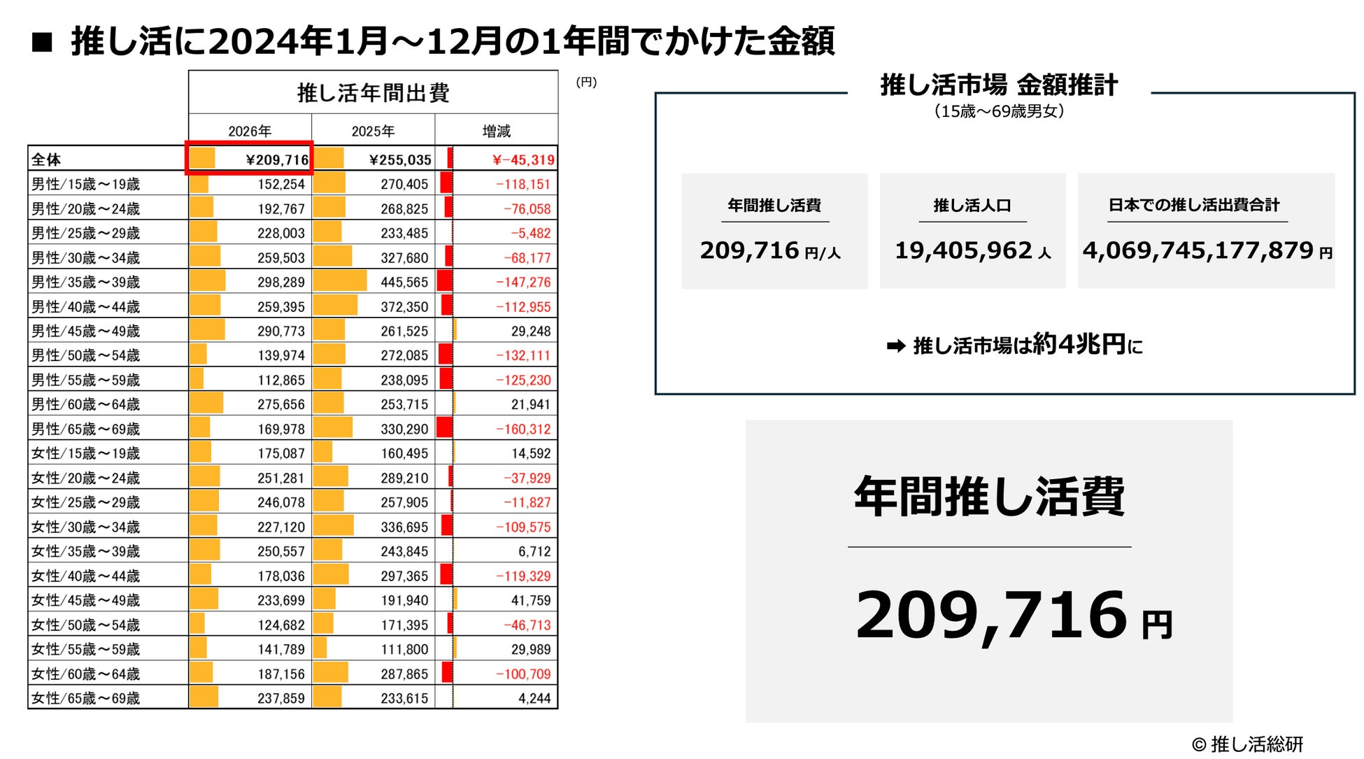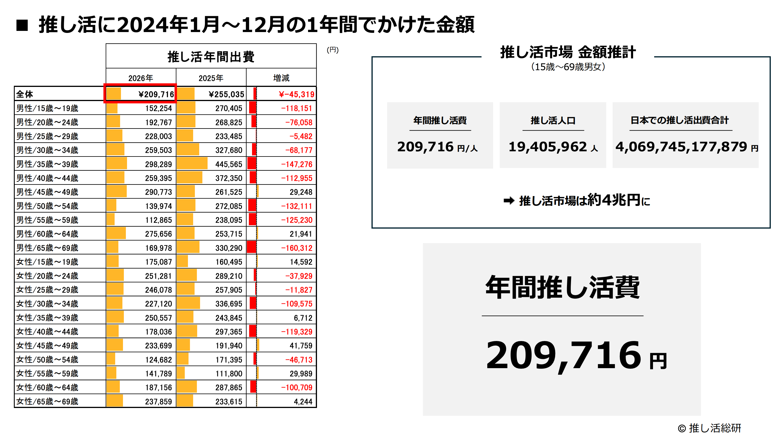 一方で今回の調査では、推し活人口が大幅に増加したにもかかわらず、推し活の年間出費額を見ると、全体平均は209,716円となり年間消費額は低下。市場全体の金額規模は拡大しているものの、前年の255,035円から減少しました。