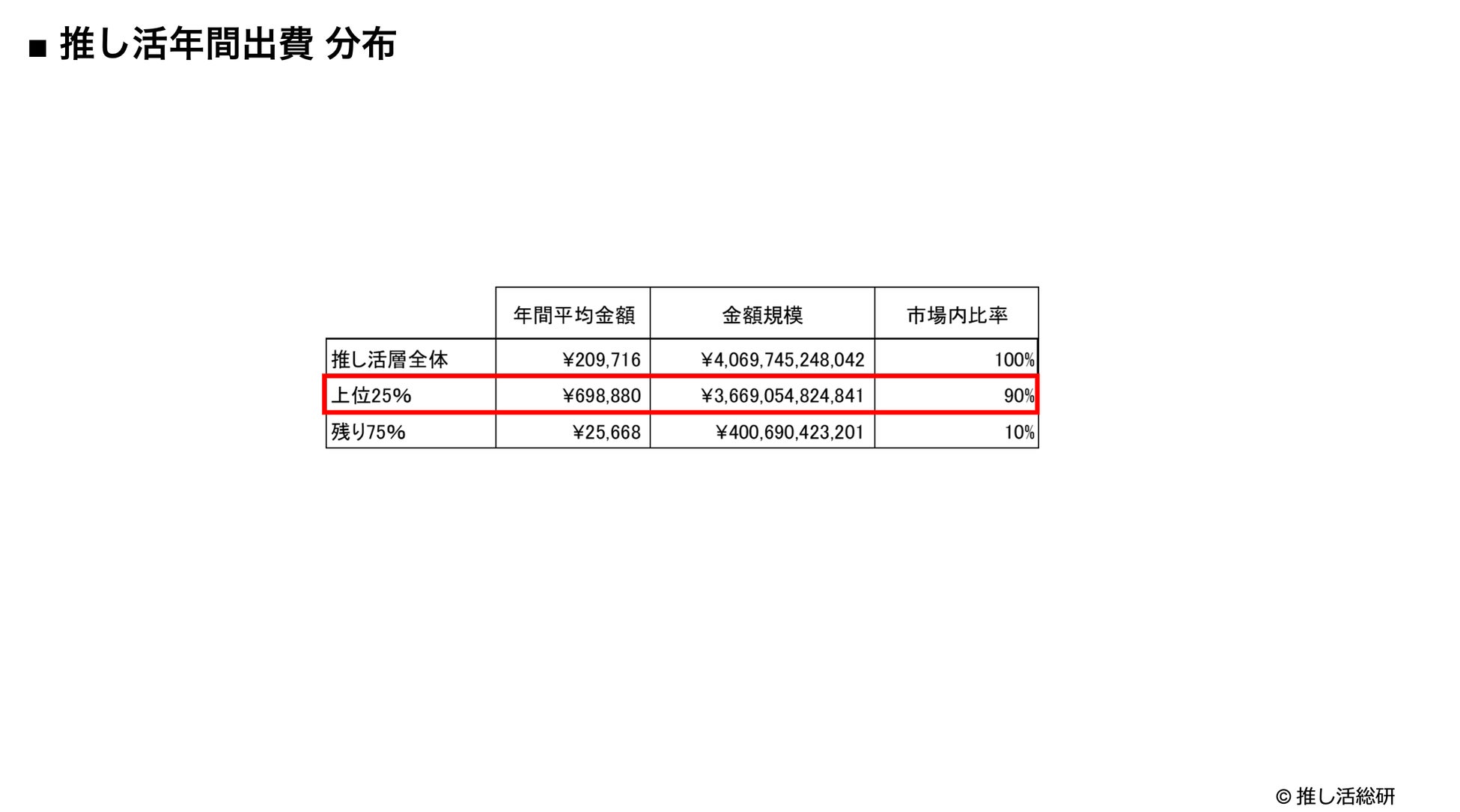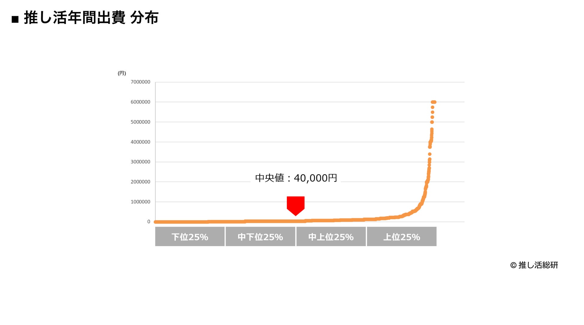 また、中央値は4万円と、平均値と比べると低い水準にとどまっており、推し活にかける金額には大きな幅があることが分かります。 さらに出費金額上位25%と残り75%に分けてみてみると、推し活への関わり方によって出費額が大きく異なり、多様な関与のスタイルが共存する活動になっていることが読み取れます。