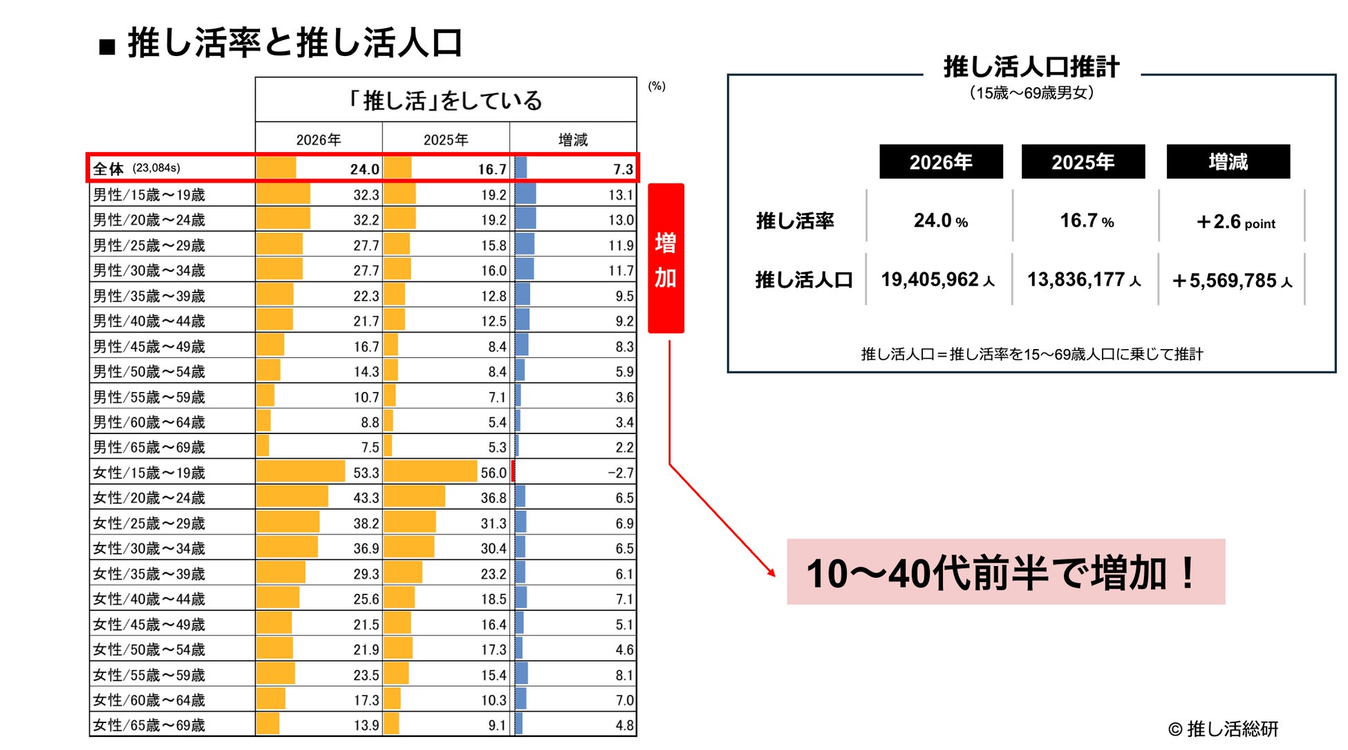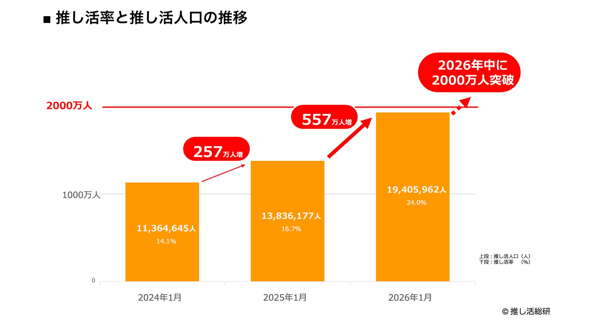 【1】推し活人口は約1940万人。前年より556万人増、2026年中に2000万人越えがほぼ確実に。