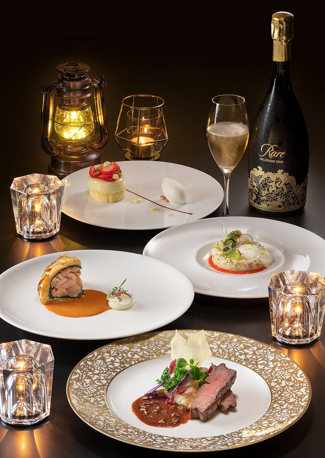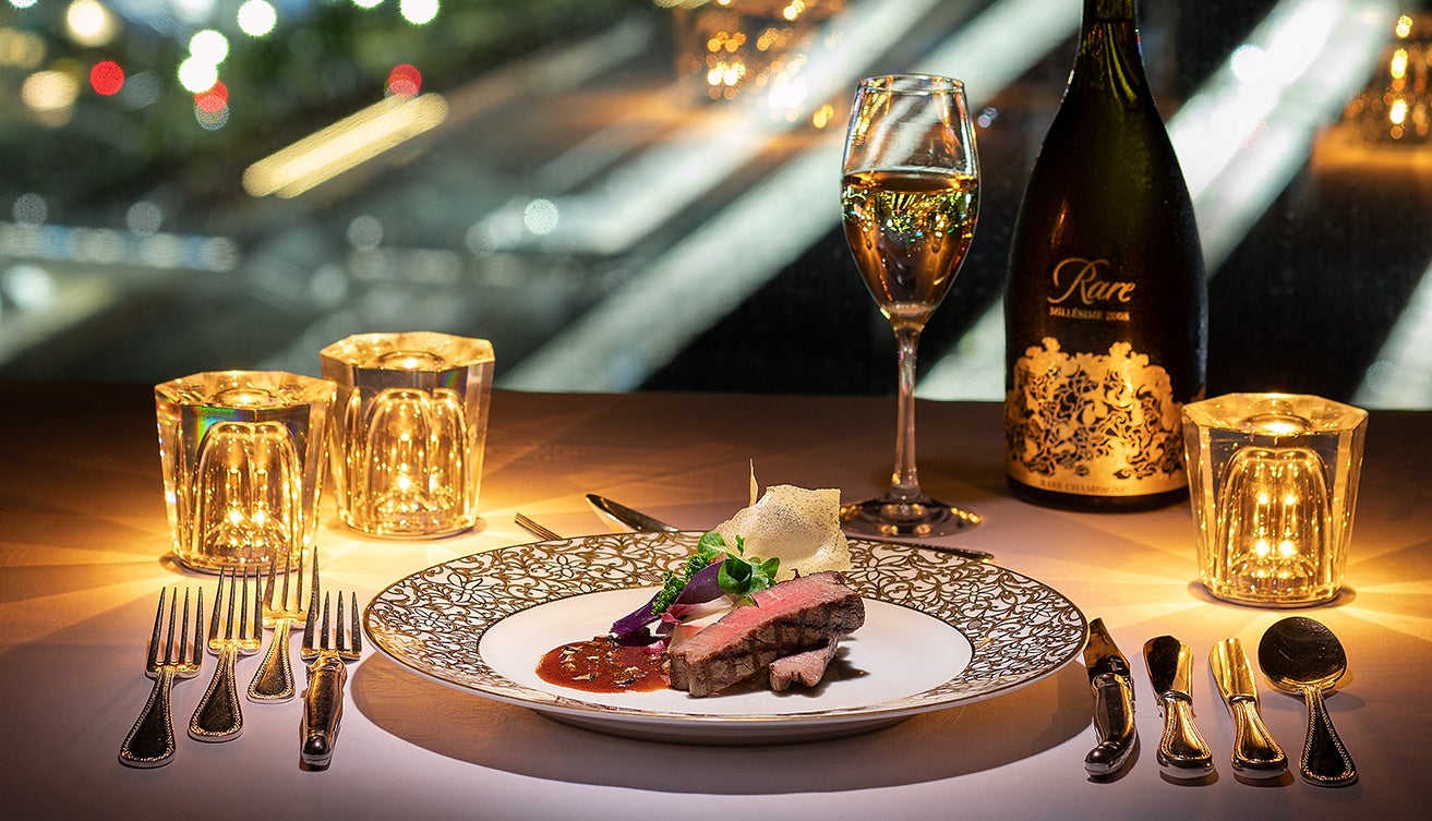 大きな窓からの夜景が美しい、ホテル最上階のメインダイニング。シェフの洗練された本格フレンチコースで、クリスマスの素敵なひと時をお過ごしください。