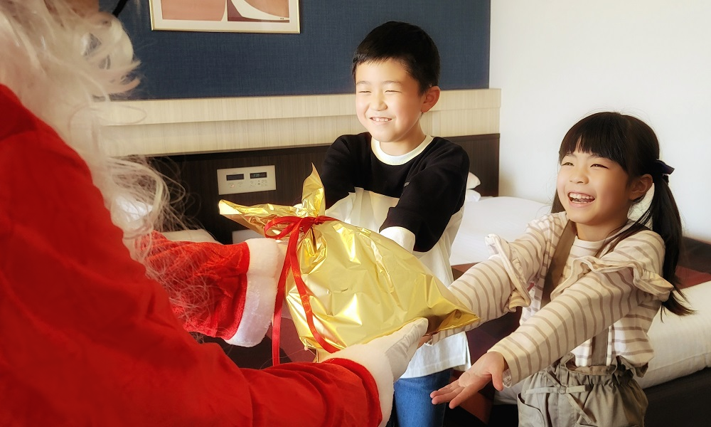 サンタクロースがお部屋にプレゼントを届けてくれるサプライズとワクワクがたっぷり詰まった宿泊プランを販売します。特典としてお菓子袋をお届けするだけでなく、あらかじめホテルにプレゼントをお持ちいただければ、ご宿泊当日にサンタクロースが直接お部屋にお届けします。お子様や大切な方へのプレゼントをサンタさんに預けて、いつもと違う忘れられない特別なクリスマスを過ごしませんか。