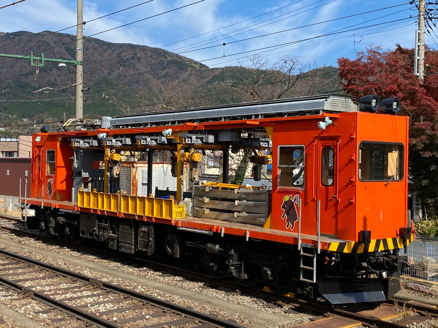 モニ1形は、1975年に製造された保守用無蓋貨物電車です。工事用の車両であるため、日中は強羅駅の構内に留置されています。2009年5月に現在のオレンジ色に塗り替えられ、沿線に出没するイノシシをモデルにした「モーニーくん」のイラストが検車区員により描かれました。その特徴的な見た目や希少性から、箱根登山電車の特色ある車両の一つとして関心を集めています。2022年9月には、ヘッドライトのLED化などの再生工事が完了し、縁の下の力持ちとして活躍中です。