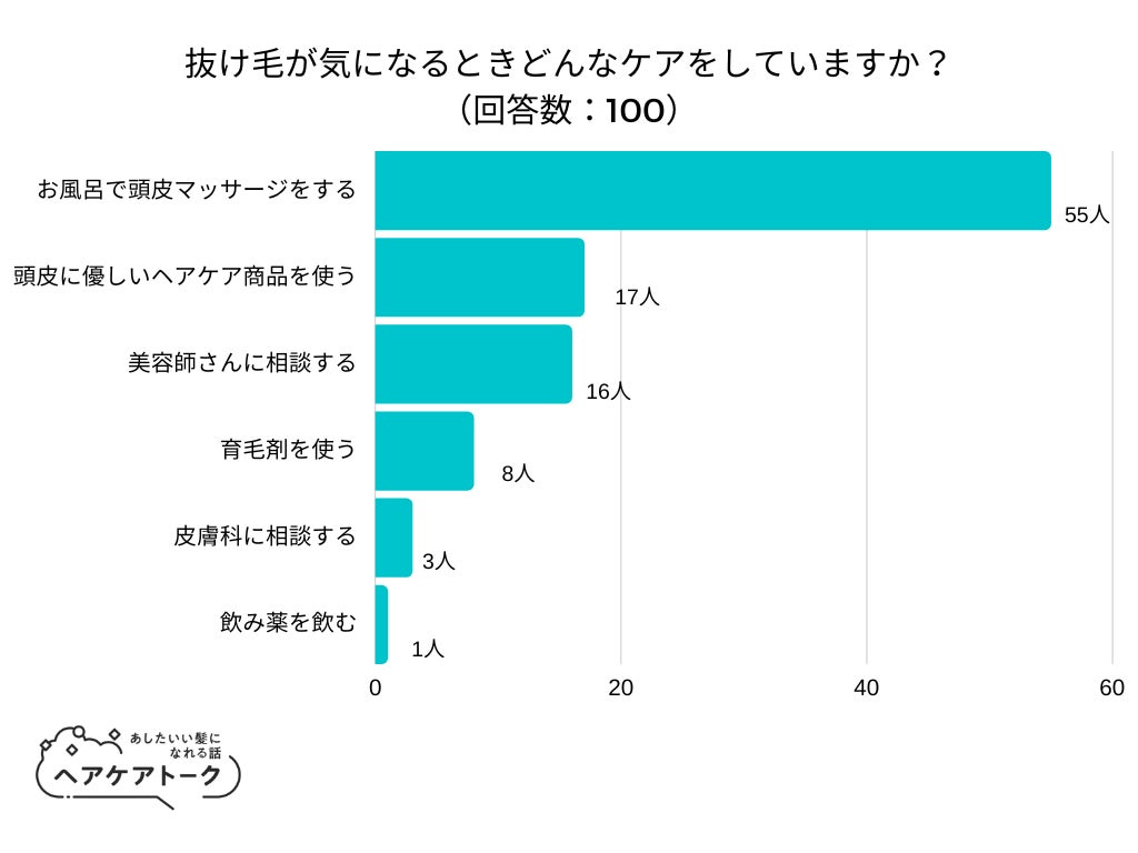 株式会社AWA(https://a-w-a.co.jp/)が運営するヘアケア情報メディア「ヘアケアトーク」(https://haircare-talk.com/ )は、日本全国の10代以上の女性を対象に「抜け毛が気になるときどんなケアをしていますか?」とアンケート調査を実施しました。