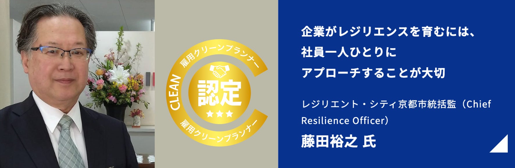 一般社団法人クレア人財育英協会(代表理事:酒井 康博)は、藤田裕之CRO(レジリエント・シティ京都市統括監)との対談記事を公開しました。この度、雇用クリーンプランナーに合格された藤田裕之CROは、レジリエンスの専門家として多岐にわたって活動を展開されています。
