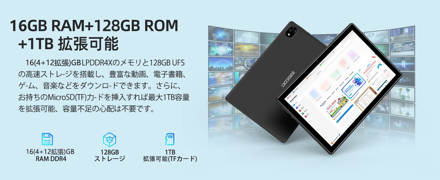 4GB物理メモリ+最大12GB拡張で合計16GBメモリ対応。アプリの同時使用や学習アプリ、SNS、動画視聴もスムーズ。さらに128GBの内蔵ストレージ+最大1TBのmicroSD拡張で、大容量のファイルも問題なし。