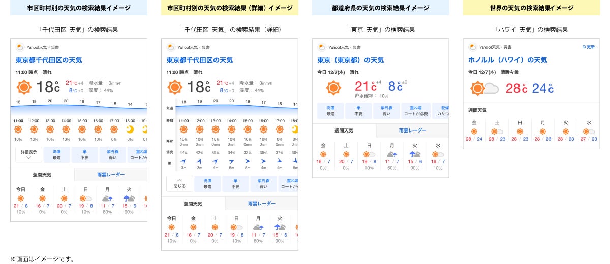【Yahoo!検索】検索結果面に表示する天気情報をリニューアル 市区町村別に、1時間ごとの「天気」「気温」「降水確率」「湿度」などが確認可能に