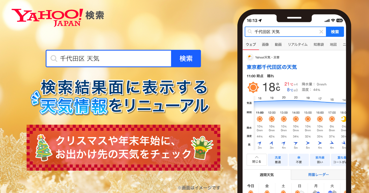 12月以降は、クリスマスや年末年始のイベント・旅行に向けた準備が進む傾向にあります。例年冬の訪れとともに寒さが増し、服装や持ち物などを決めるにあたり天気情報の確認が重要です。「Yahoo!検索」では、検索結果面に表示する天気情報をリニューアルし、より日常生活やお出かけなどに便利な機能の提供を開始しました。