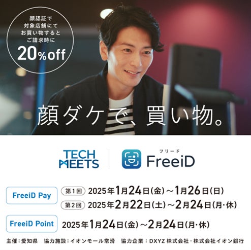 愛知県が主催するあいちデジタルアイランドプロジェクト『TECH MEETS』にて、ニーズ企業・施設として参画した、イオンモール常滑と株式会社イオン銀行(本社:東京都千代田区、代表取締役社長:木坂有朗、以下「イオン銀行」)と、シーズ企業として採択※1されたミガロホールディングス株式会社(本社:東京都新宿区、代表取締役社⻑:中⻄ 聖、証券コード:5535) のグループ会社DXYZ株式会社(本社:東京都新宿区、取締役社長:木村 晋太郎、以下「DXYZ」)は、DXYZの顔認証IDプラットフォームFreeiDを活用した「顔ダケで、買い物。」実証事業を2025年1月24日(金)より開始することをお知らせします。